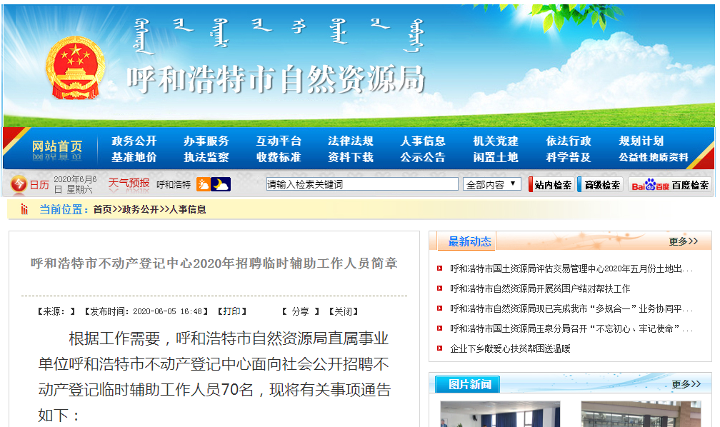 根据工作需要,呼和浩特市自然资源局直属事业单位呼和浩特市不动产登记中心面向社会公开招聘不动产登记临时辅助工作人员70名,现将有关事项通告如下: ...